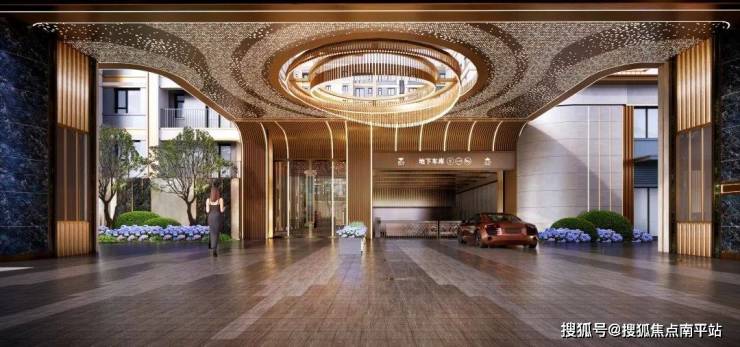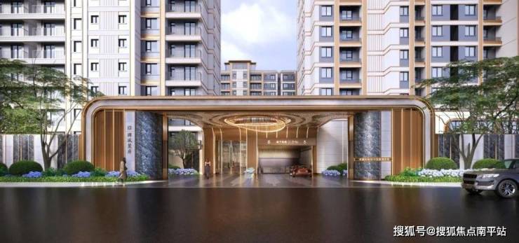 项目的社区大门在交付地块基础上全新升级,采用深金色金属线条勾勒,搭配轻奢石材,顶部设计了劳斯莱斯同款奢华星空天幕,归家仪式感拉满。