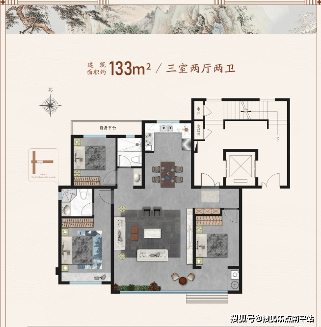 其中约133㎡户型,坐享约5㎡电梯前室空间,北向设备平台(5㎡以内),加上飘窗的空间赠送,显著提升该户型的综合得房率。