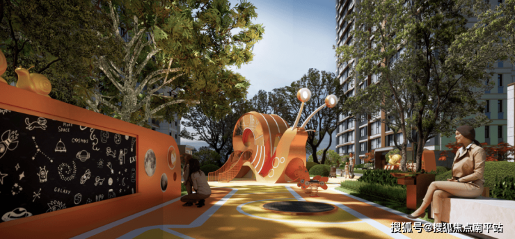 同时,项目的园林景观以大门入口、中央会客区、环抱水景、蜗牛历险记主题乐园、下沉围合式休闲区、有氧健身区等维度串联起整个景观轴线,更诗意灵动的动线设计,更精细优化的品质营造,带来更有交互性的园林体验。