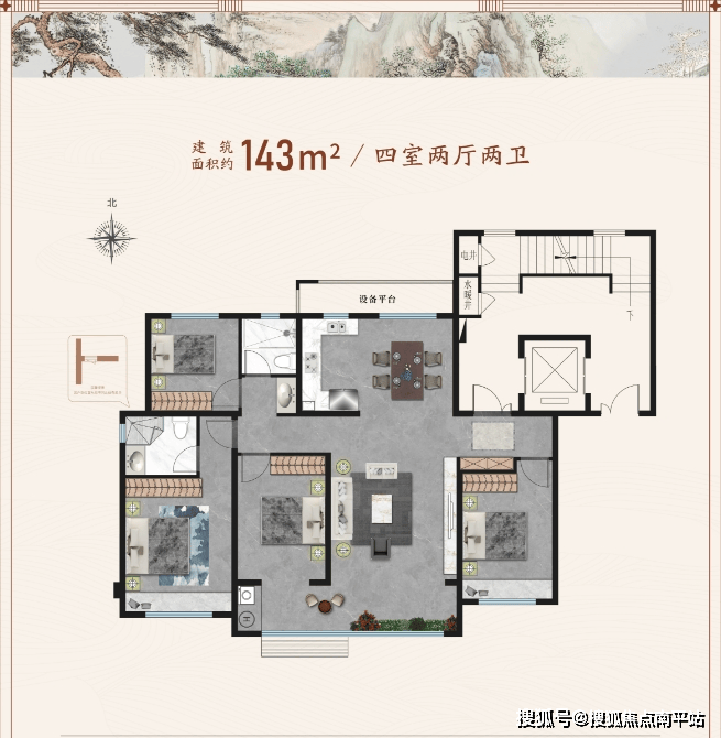 而约143㎡户型,则采用了标准四房的设计,南北通透,设备平台的利用更为灵活,南向四面宽+双阳台的配置,让这款产品的关注度非常高。