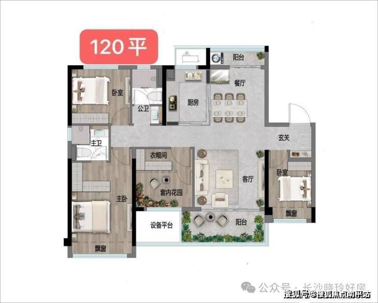 3+1房设计,南北双阳台,通风采光舒适,南向阳台长约6.8米,餐客厨一体。