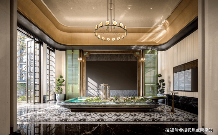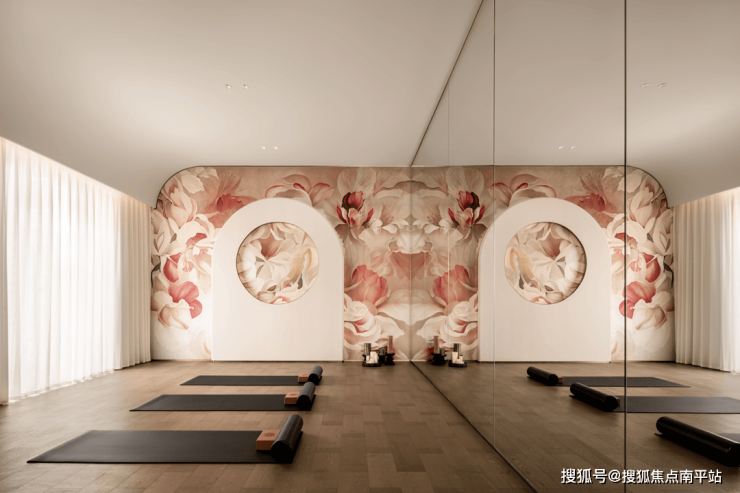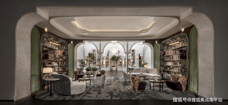 庭院空间采用创新的三重嵌套设计,精心构建出三种截然不同的情绪氛围。中心庭院的天花透光拼花窗格随日影变换,为在此交流的居民投射出斑斓光影,营造出梦幻而浪漫的氛围;凤凰廊架后方的紫藤花境,以自然植被打造出充满诗意的浪漫意境;而对称设计的狮头涌泉,则带来静谧而优雅的氛围,为居民提供一个宁静的休憩空间。