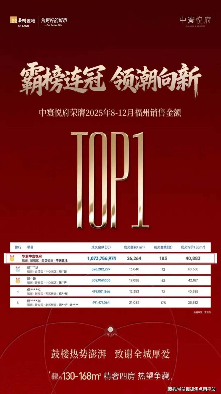 当福州楼市陷入以价换量的平淡期,华润置地中寰悦府却以现象级热销打破沉寂,强势登顶2025年8-12月福州销售金额TOP1,用高流速、高溢价的双重亮眼表现,成为福州高端市场的逆市标杆。