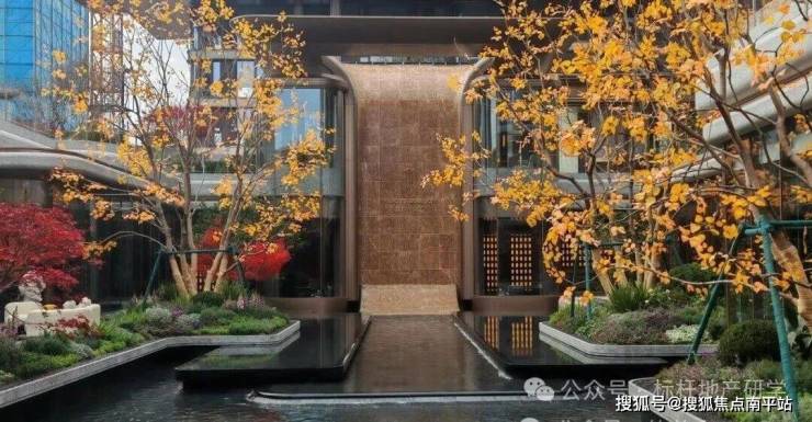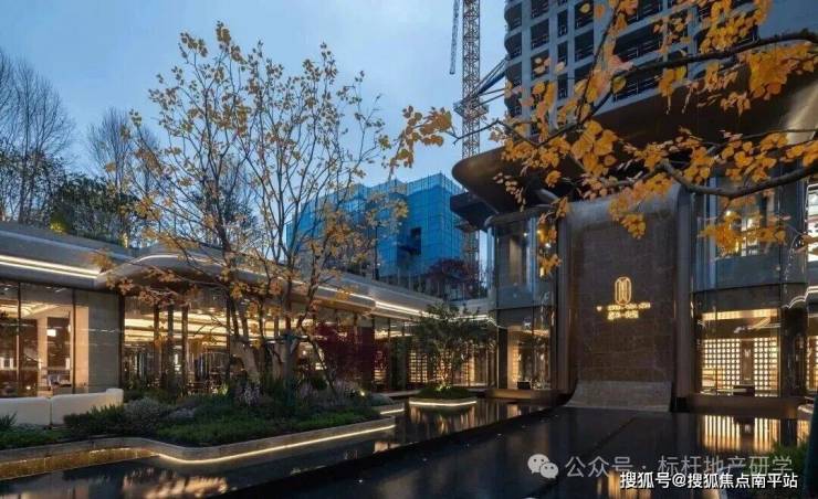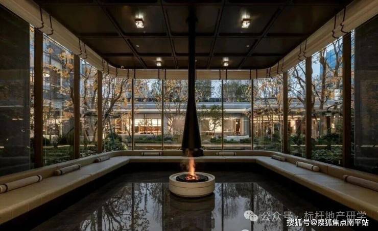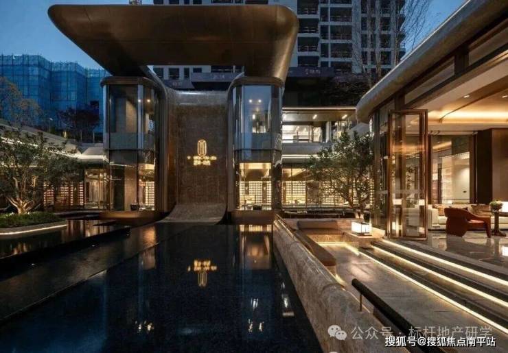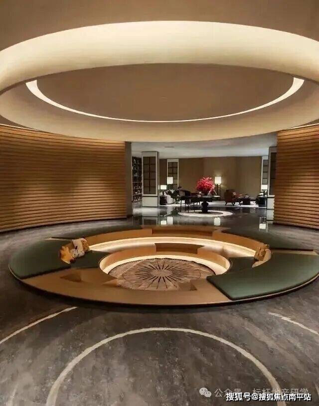 约1000平方米下沉式庭院,灵感源自“湘江之水天上来”,水流自高处引入,约11.8米跌水瀑布与细幕倾泻,尽显精工美学与磅礴气势。中央镜面水景如琉璃铺展,将天光云影与建筑轮廓尽收其中。鎏金水瀑、奢石卡座与珍贵绿植疏影交织,室内外景致无界渗透,一步一停皆染诗韵。