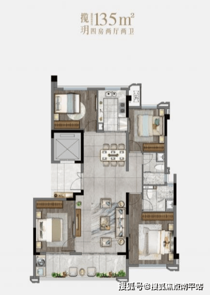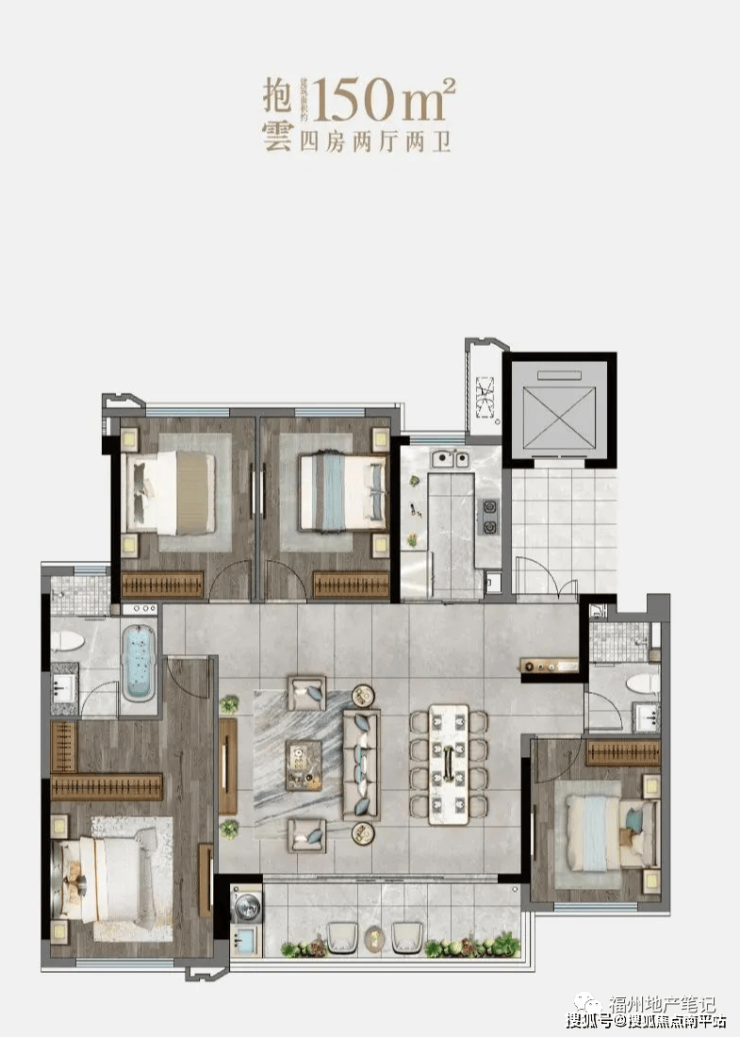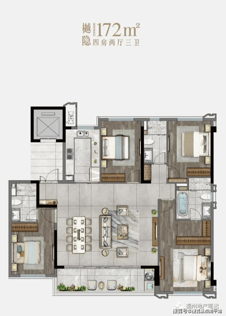 项目户型为135㎡、150㎡四房两厅两卫,172㎡四房两厅三卫,均为一梯一户电梯独立入户,户内层高3.05米-3.1米,精装修交付。
