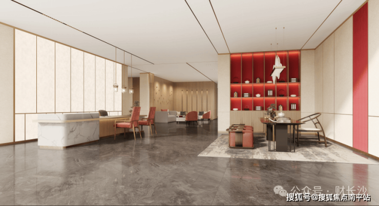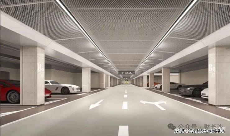 ⭐层高约5.5米车库入户大堂,质感空间升级归家仪式体验;车库采用耐磨型环氧地坪漆,在顶部规格打造上,对标长沙商业豪宅大平层,使用大面积铝板透光天花、异形立体铝拉网天花等豪华配置。