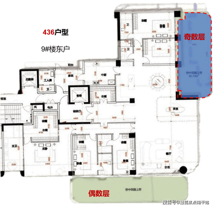 奇偶层的差异也是在露台位置,奇数层在南向的主次卧+北向露台,偶数层的露台在客厅+次卧套间,这俩者探长认为各有优势,偶数层的露台更强调社交属性,奇数层的露台更偏生活情趣,建议就是E人选偶数层,I人选奇数层。
