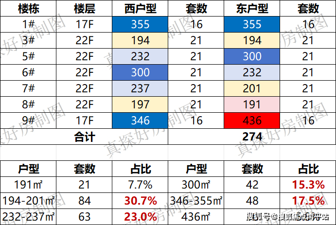 项目总计274套房源,其中191-237㎡的户型168套,占比61.31%,300㎡以上的大户型106套,占比38.69%。