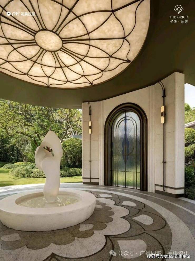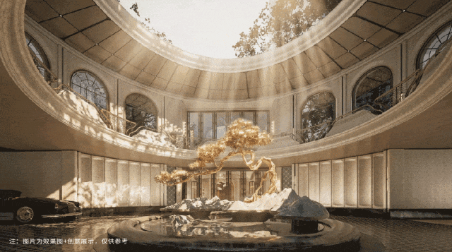 其中,“天圆地方”圆厅,以日照金山,石来运转”为设计灵感,再加上摇钱树雕塑及宝相花纹铺装,将广府人讲究的好彩头巧妙融入。