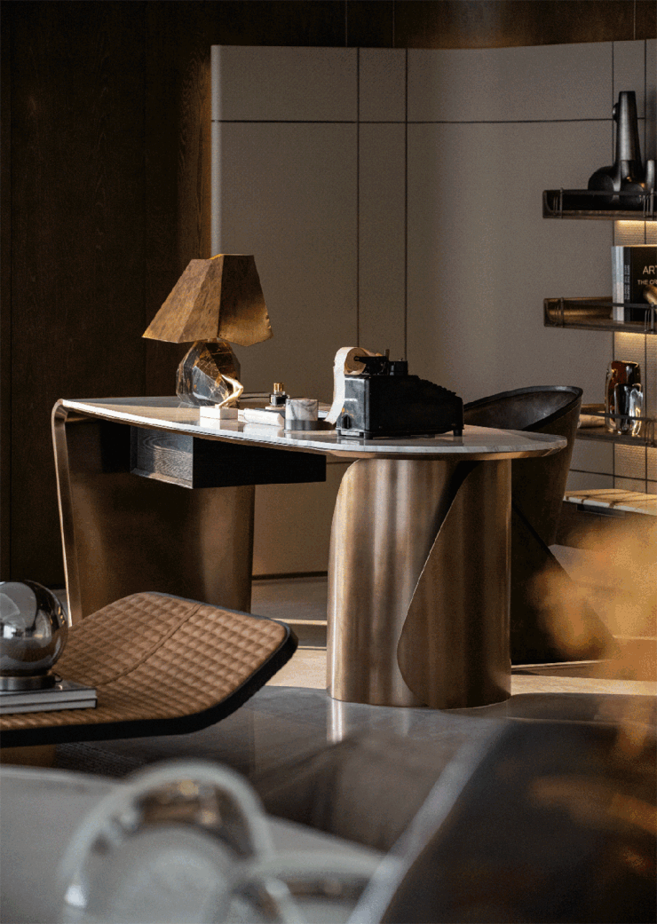 精致的金属展示柜映衬着暖意的灯光,为珍藏的艺术品赋予独特的魅力,大理石书桌搭配古铜色几何造型桌脚,每一处细节都在述说着自信优雅的生活格调。