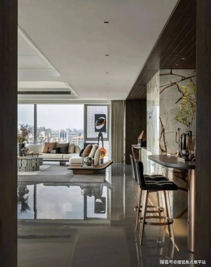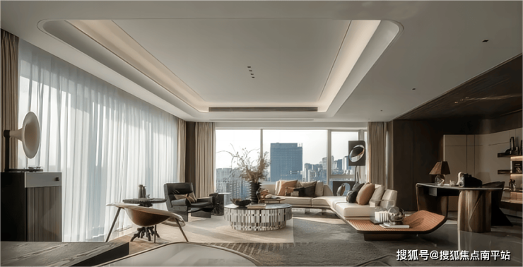 开阔的布局形式营造出轻松温馨的氛围,城市美景一览无余,私享天际线。运用不同材质的家具组合,让空间充满生活气息,俯瞰都市繁华。