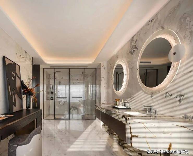主卧卫生间以21m²奢阔的大尺度赋予了奢华酒店的舒适体验感,整体墙地面采用天然纹理的奢石打造,台面长达2.6米,为男女主人打造更具舒适与便利的功能空间。