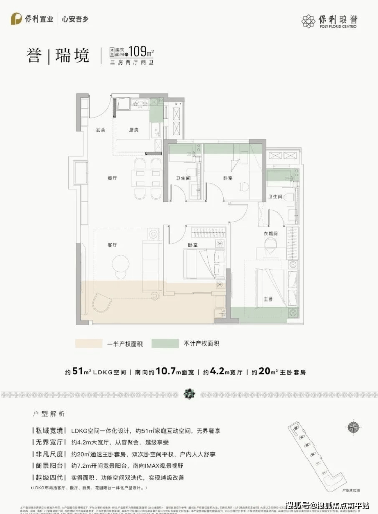 109㎡户型:三房两厅两卫,该户型为三房两卫,三开间朝南,入户玄关收纳空间,南向面宽约10.7米,约7.2米的南向宽景阳台,51㎡的动区空间,约20㎡的主卧套房,还是双卧朝南设计。此外,主卧、次卧、厨房有不少全赠送空间。