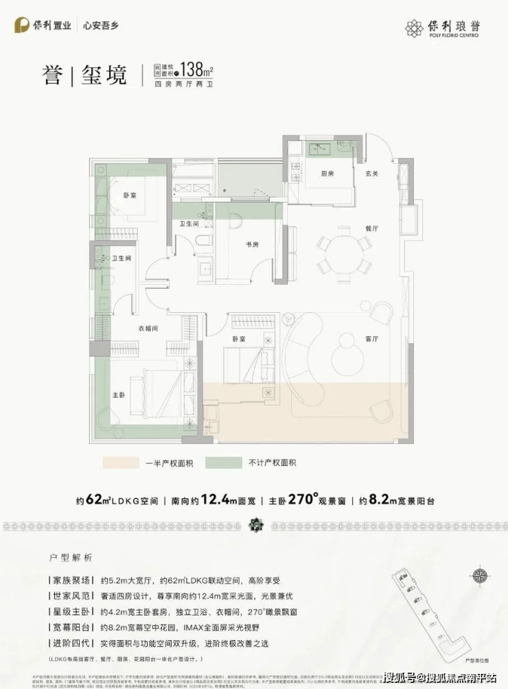 138㎡户型:四房两厅两卫,该户型为四房两卫,三开间朝南,入户玄关,南向面宽约12.4米,约8.2米的南向宽景阳台,完全动静分区设计,有62㎡的动区空间,双卧朝南,主卧为270°观景窗设计。