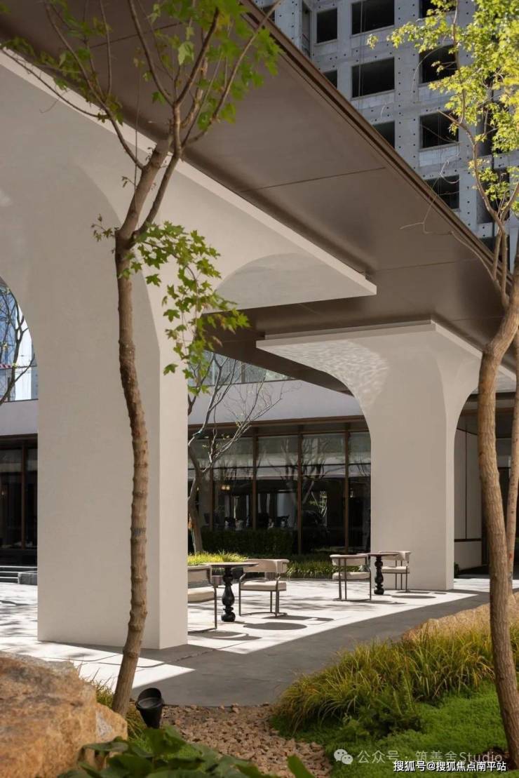 融合四颗精选朴树,旱喷广场打造出中心聚合的舒适空间,营造出轻松愉悦的生活烟火气息。