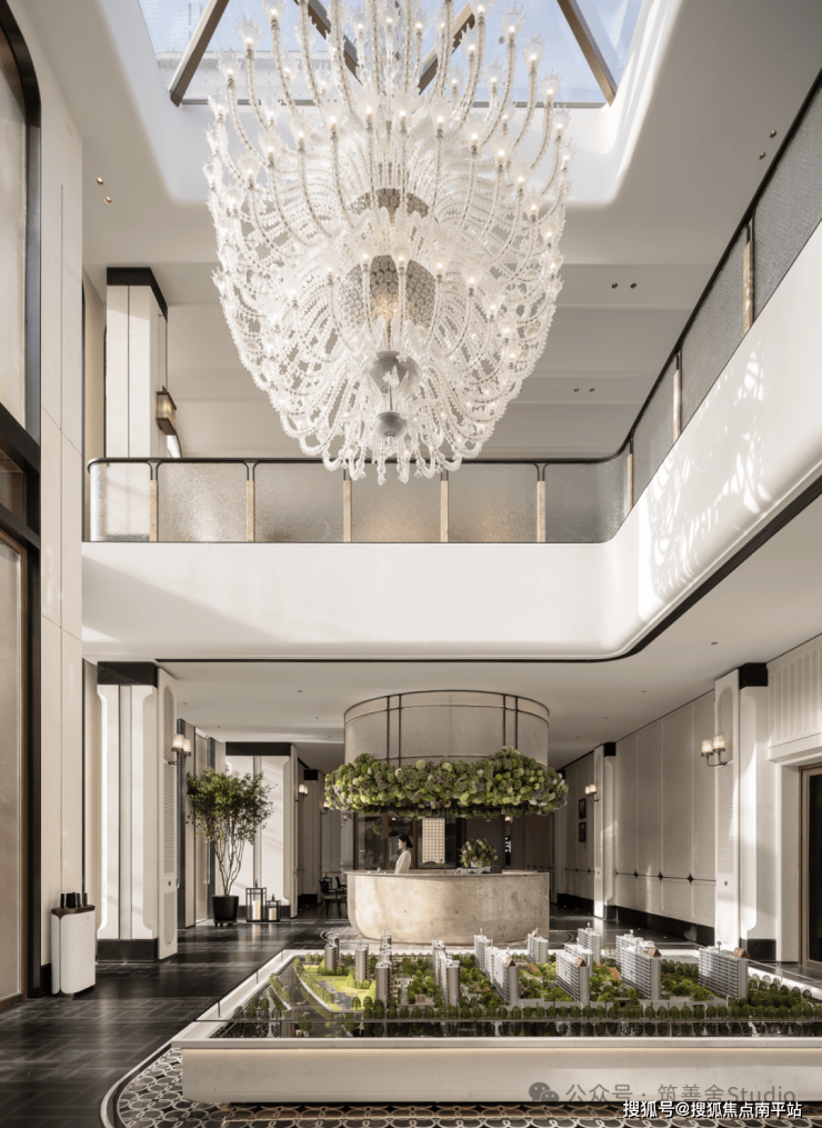 璀璨垂挂的水晶吊灯,宛如一朵经过精心拆解的海棠花,自中心向外绽放出优雅弧线,与空间内无处不在的曲线艺术相映成趣,把城市记忆转化为光学符号的巧妙构思,使功能性的沙盘展示区升华为一处引人入胜的沉浸式体验剧场。