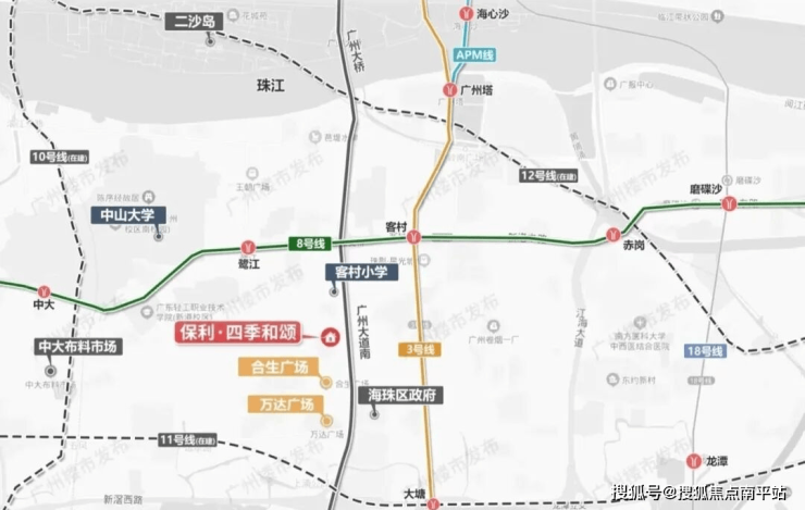 项目距离最近的地铁站是8号线客村站和鹭江站步行距离都是1.5公里左右,周边还有3/10/11号线,4条地铁交汇,1站可达广州塔,2站到珠江新城,3站至琶洲西区。