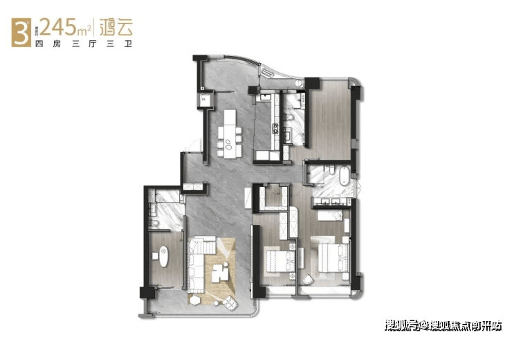 青云上府1#栋约218㎡全豪装大平层产品,户型打造南向四开间、南北通透,通风采光俱佳,两梯两户私梯入户、独立玄关,礼遇归家,LDKB一体化,奢阔生活场域,南向双套房,奢适居住体验。