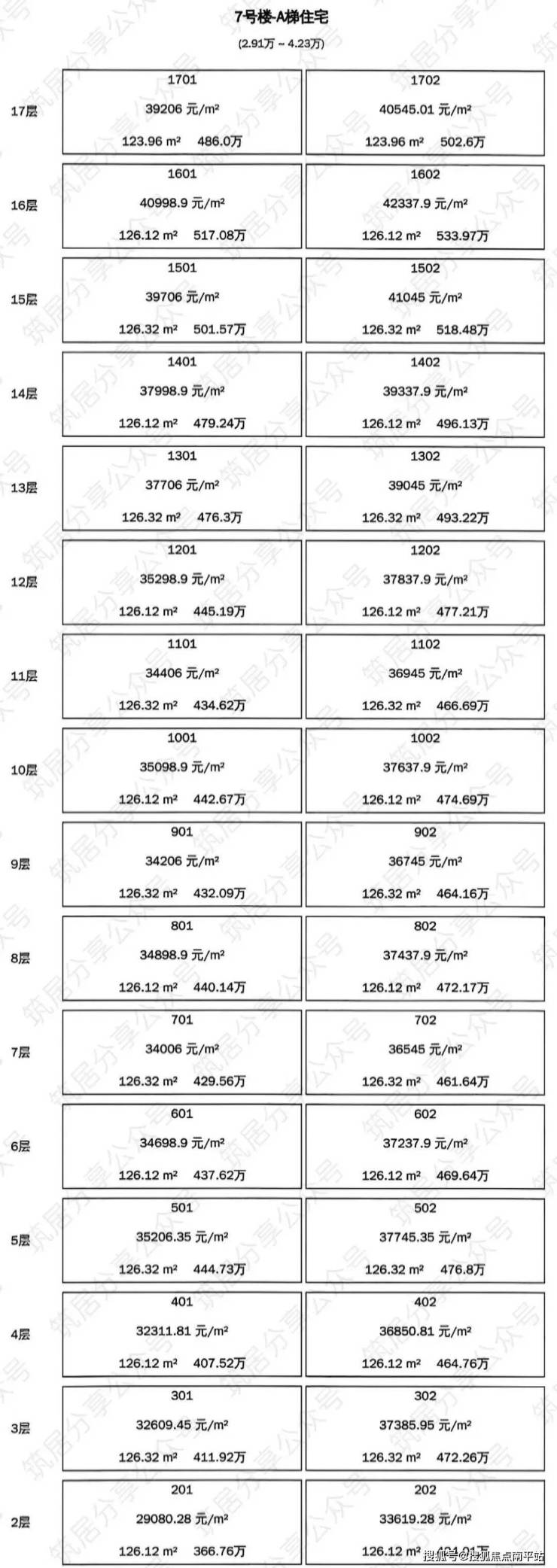 A梯2.91-4.23万/㎡,均价3.67万/㎡,总价362-521万;