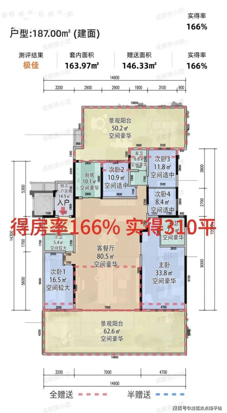 看看上图是成都的第四代洋房,建面187平,赠送了146平,文哥看了都傻眼了,赠送面积相当于产权的78%,而厦门这边政策允许的第四代住宅露台最多只能做到产权面积的30%。