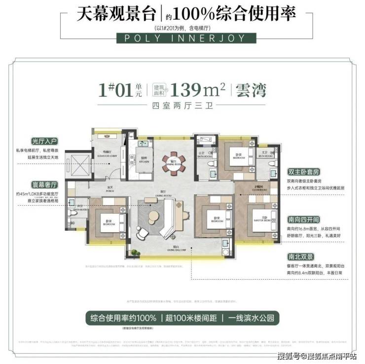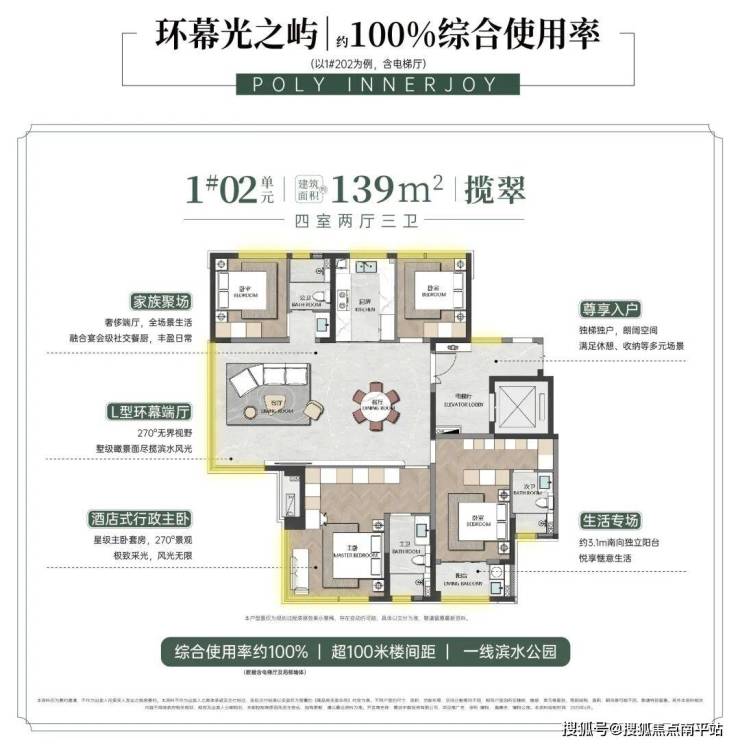 在优质土地稀缺性日益凸显的背景下,保利·瑧悦|观樾以约100%综合使用率(以1#楼202为例,含电梯厅)的建面约125-220m²奢居,约2.2容积率低密洋房住区,与公园水岸无界交融,构建起隐于公园绿境中的奢享生活,超越莆田范式的“樾式生活体系”,从空间、景观到服务的全维度价值闭环。