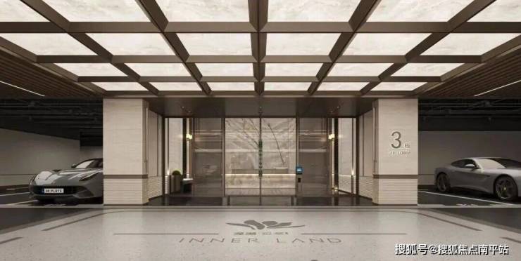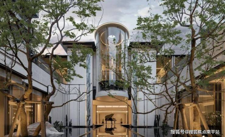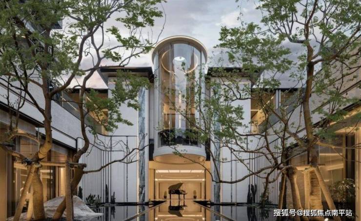 主入口以69米超尺度城市界面展开,融合7米高柱式挑檐,复刻奢华酒店落客环岛设计,营造仪式感的归家序章。归家路特选10米高丛生铁冬青“树王”作为迎归象征,结合三重奢石景墙与静谧镜面水景,构筑出充满领域感的城市界面。树木与水景相互映衬,天光与倒影交织成震撼视觉,在神性与光影的渗透中,形成引人入胜的精神场域,强化了归途中的仪式感与体验深度。围绕下沉庭院配备台球室、健身房、棋牌室、高尔夫、练歌房、私宴厅等功能,形成一体化的配套共享空间。