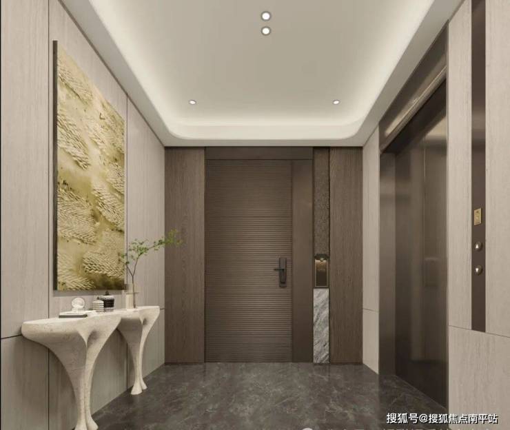 地上地下公区动线通过材质的精心搭配与空间比例的把握,营造出兼具仪式感与舒适度的归家体验。大堂整体以自然系为基调,地面选用大规格仿大理石瓷砖,配合精细水刀拼花设计,主背景墙由仿玉石超大岩板和木饰面屏风构成,形成丰富的视觉层次细节处理上,设计运用弧形元素提升空间艺术感,结合岩板拉槽、金属腰线,以及定制灯具灯带的结合,打造更具温度和仪式的归家路。不同材质的交叠,与空间体量呼应,让每一次归家都成为舒缓身心的开始。