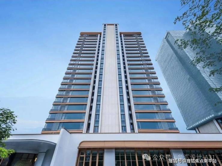 建筑立面精工雕琢,横向香槟金铝板采用整板锻造工艺,窗洞周边配以精致线脚肌理,强化立面韵律感。玻璃采用整幅开启设计,以化整为零手法对窗间墙进行玻璃一体化覆面处理,弱化实体界面。飘窗格栅提升工艺精度,并融入项目LOGO符号化设计,使建筑横向线条舒展流畅,整体质感柔和精致、现代大气。