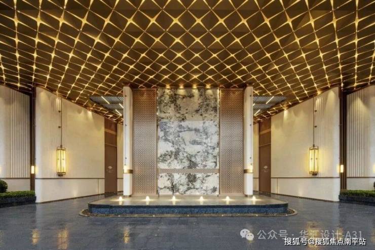 30米跨度、6米挑高的社区主入口,以片柱与石墙为基底,搭配巴西「雪山蓝」奢石背景墙,构筑酒店化高端迎宾界面,彰显尊崇仪式感。