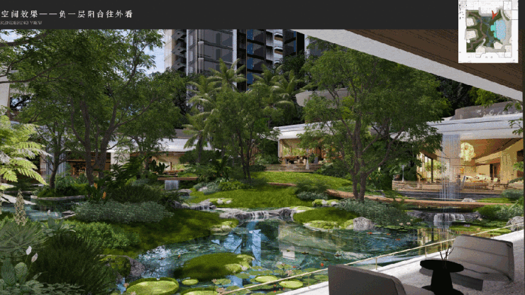 WTD纬图设计将中央庭院打造成一个可步入、可沉浸的“秘境雨林”。园林以“生息浮岛,秘境雨林”为理念,打造贯穿南北的“碧珀水轴”,串联碧珀叠溪、无界泳池、幽谷树屋等七重景观。7米高空中悬瀑垂落林间,会所隐于幽谷,营造沉浸式热带自然体验。