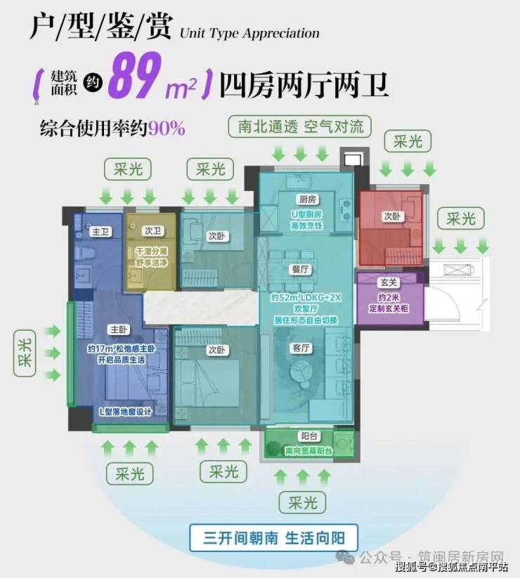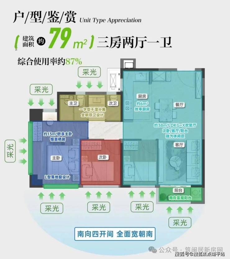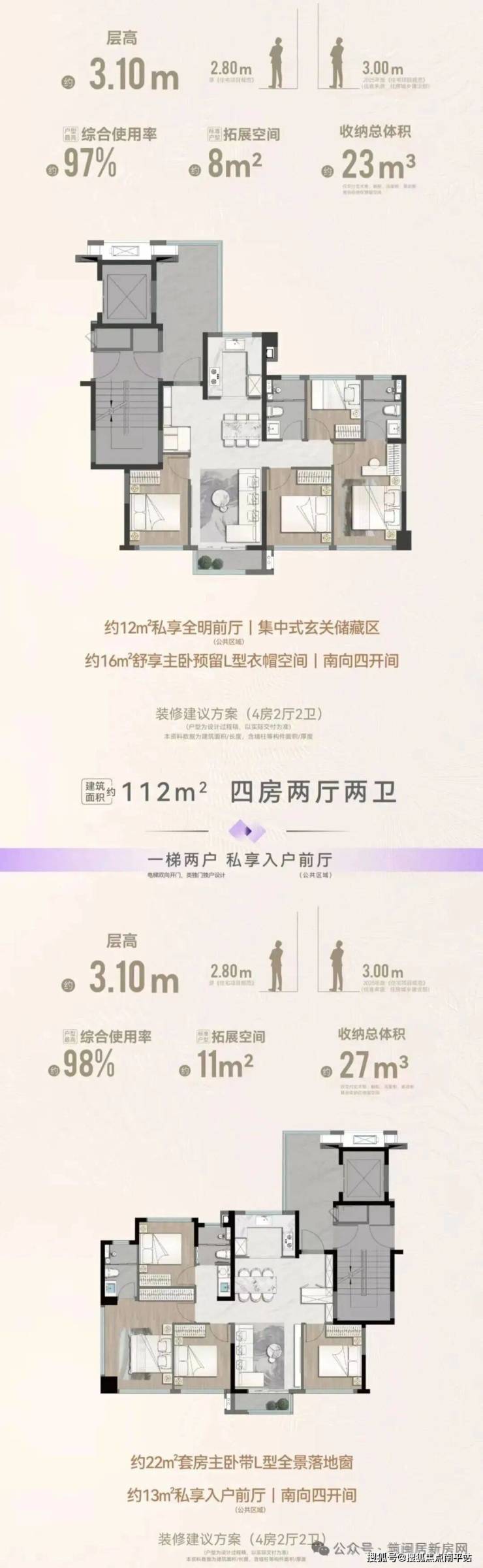 项目规划4栋瞰海高层(部分)2梯5户,64㎡2房、75㎡3房、79㎡3房、89㎡4房,(得房率85%—90%)层高3米;5栋低密洋房,95㎡和112㎡4房,得房率97%—98%)层高3.1米,类独梯独户设计,户户都有一个12-13㎡的入户电梯厅。高层和洋房全系均有外阳台。
