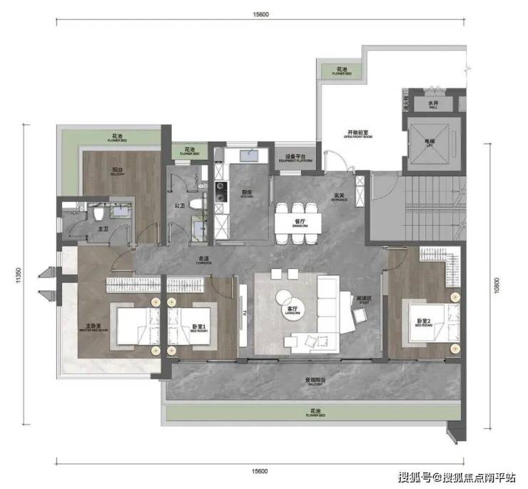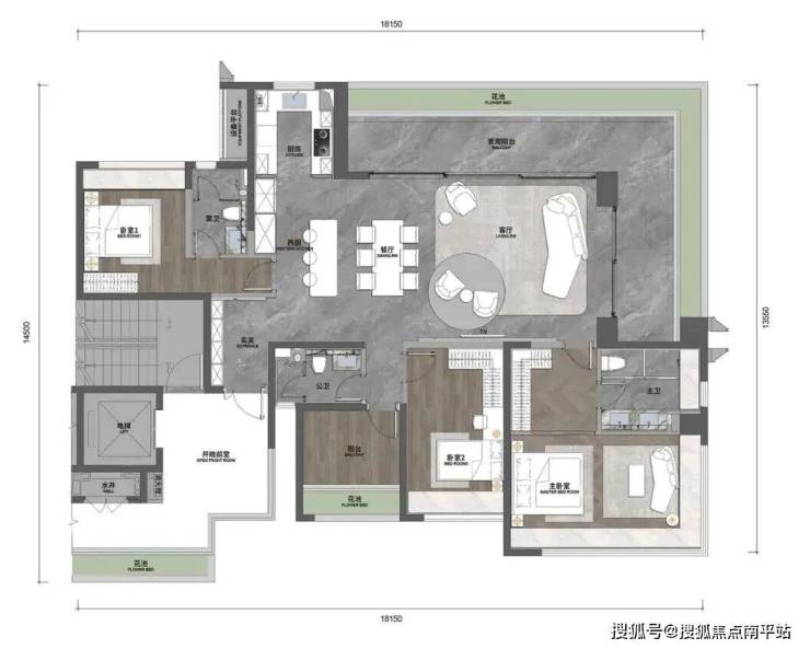179㎡做了四房三卫,端厅设计,L型大阳台,不过为了追求通海公园景观视野,客厅阳台做了北向,1间套房也是北向,另外3个卧室为南向,主卧套房带独立衣帽间+270°大飘窗。