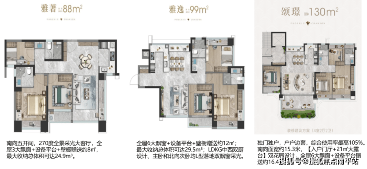 项目创新拥有【私家入户花园+大飘窗赠送+四代宅空中花园】,88-99㎡瞰景高层拥有83-89%综合使用率,130-140㎡洋房达到105%的综合使用率。