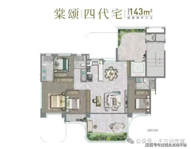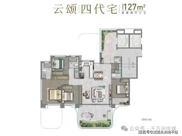 127㎡四代宅:别墅级层高3.15米,综合使用率约116%-120%,相当于180㎡独梯独户大平层;5.6米超大客厅,双主卧设计,4+1房可变空间;空中花园奇偶错层设计,南北双花园。