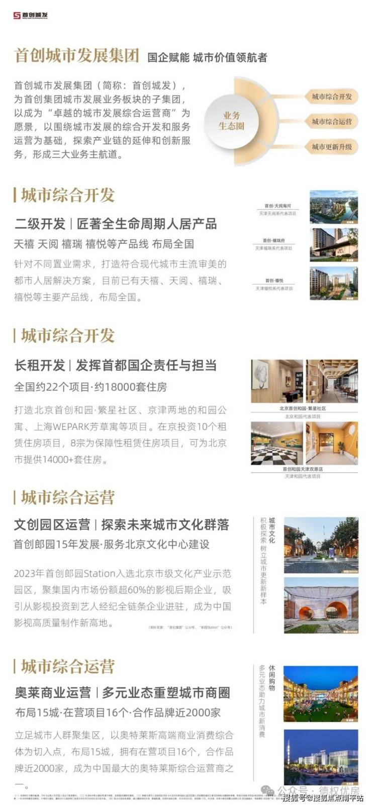 首创城市发展集团(简称:首创城发),首创集团城市发展业务板块子集团,针对不同置业需求,打造符合现代城市主流审美的都市人居解决方案,目前已有天禧、天阅、禧瑞、禧悦等主要产品线,已在全国布局约140个精品住宅项目,并运营16家首创奥特莱斯、22个租赁住房项目。