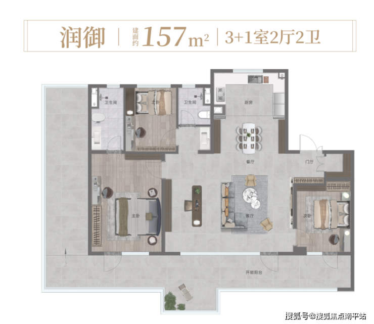 建面约157㎡户型拥有约7m巨幕宽厅,内部不仅拥有创新设计3mx3m空中浮岛阳台,更是设计了270°环幕超大露台。