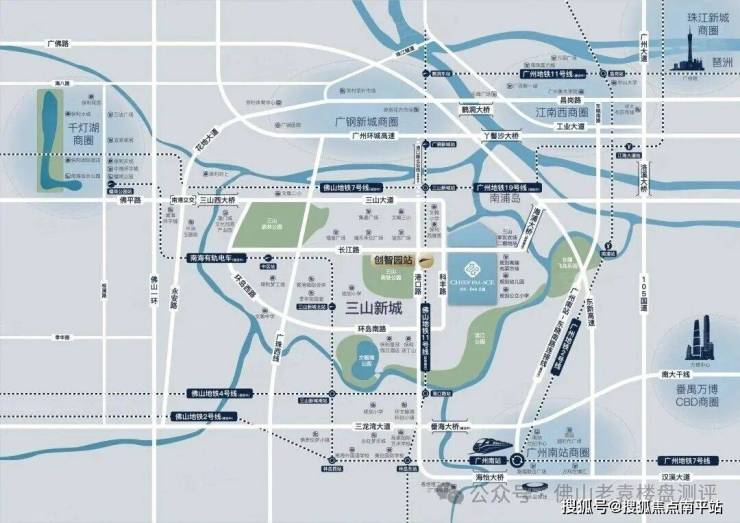 项目地址:佛山南海桂城三山新城长江路与科丰路交汇处,三龙湾科创核心区、千灯湖东拓临广板块
