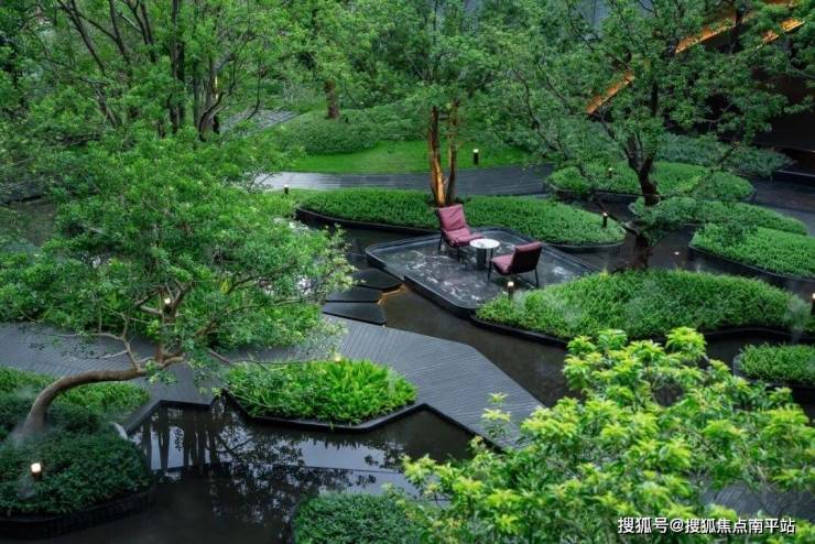 而社区园林则如漂浮于江上的绿岛,层层叠退,确保低楼层也能享有开阔视野。