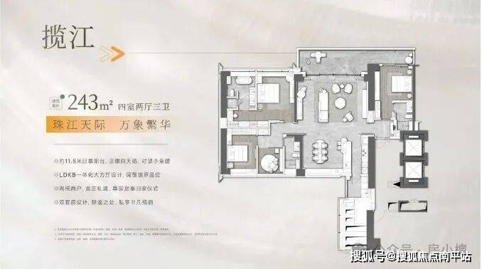 稀缺江景:拥有一线稀缺的江景,随着江景资源越来越稀缺,广州江景房越来越少,江景大平层更是稀缺。