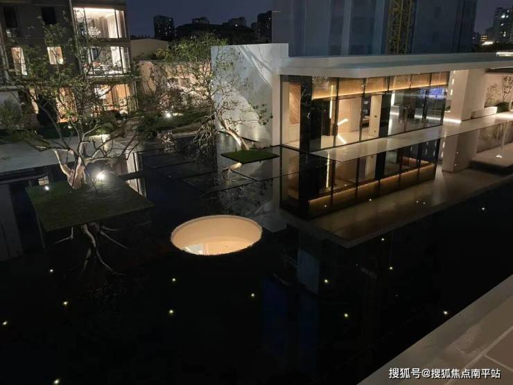 当夜幕降临,水中点点的灯光亮起,宛如星星藏于池底。水中一个圆形的天井,与地下光线相通,是天上月,也是水中天。