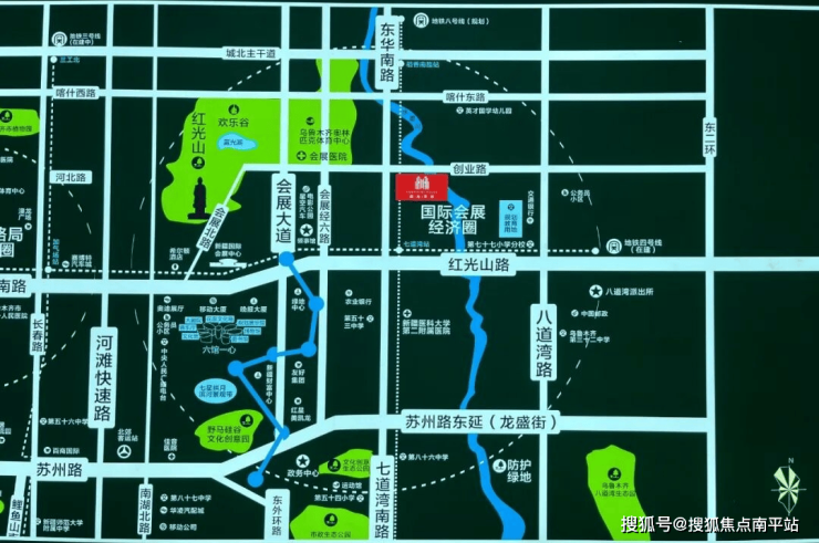 裕丰·阳光河畔位于首府会展版块。在乌鲁木齐“南控北扩,东延西进”、“打造中国面向中西亚的区域性国际城市”的发展战略下,红光山会展新区将规划成为中西亚政治、经济、文化、信息的代表性中心,更是城市对外形象的展示窗口。