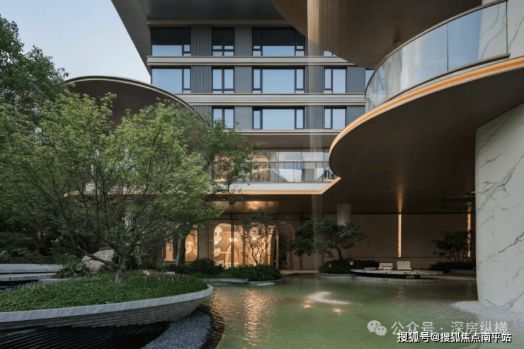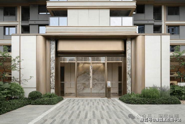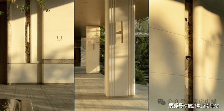 单元入口:单元大堂立面延续主体现代雅奢风格,立面简约利落,以米白色月光米黄石材、香槟金铝板及潘多拉彩虹印象奢石呼应主体白金色调,以精工细节强化立面品质,石材采用波浪纹、圆弧倒角、拉槽、抛光等细节工艺,铝板采用倒角、凹槽结合密拼工艺,提升归家尊贵感。