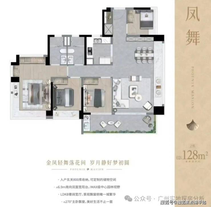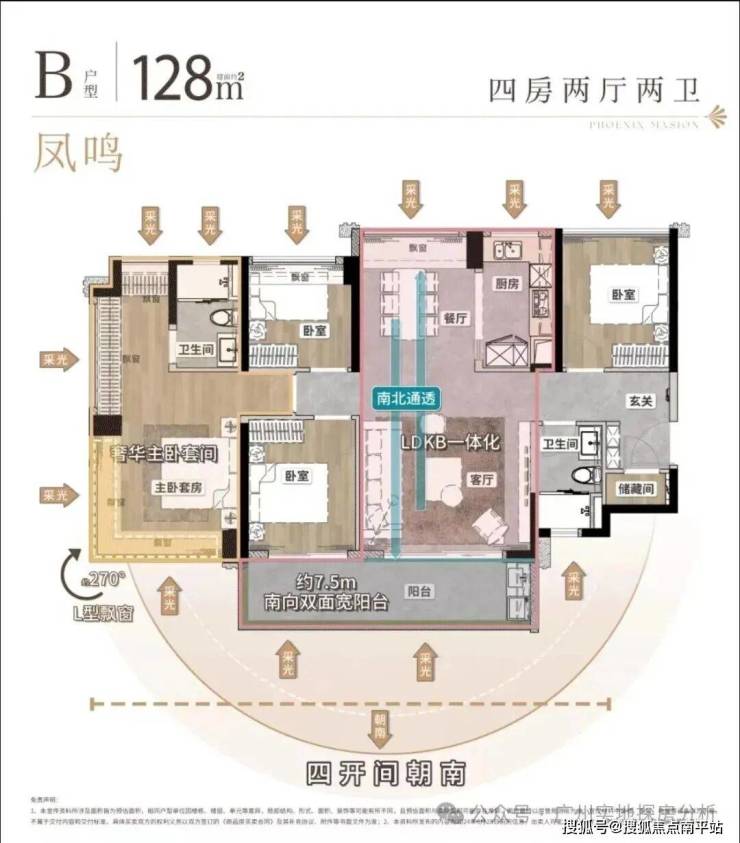约128㎡四房两厅两卫,南向四开间,约7.5米双面宽阳台,约100%使用率。