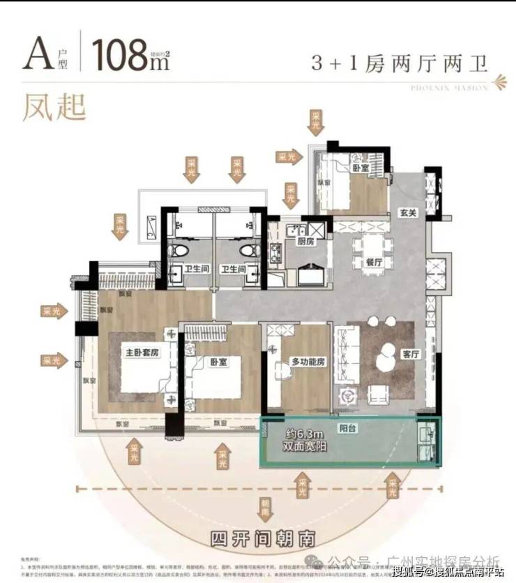 108㎡3+1房两厅两卫,南向四开间 ,约6.3米双面宽阳台,约100%使用率。