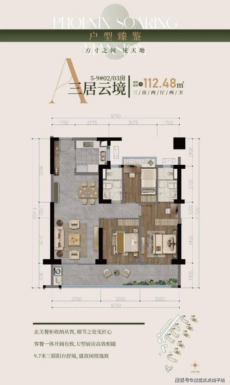 112㎡全能三房: 高效利用空间,功能齐全。约9.7米观景阳台,U型厨房与明卫配置,在有限面积内实现舒适生活。