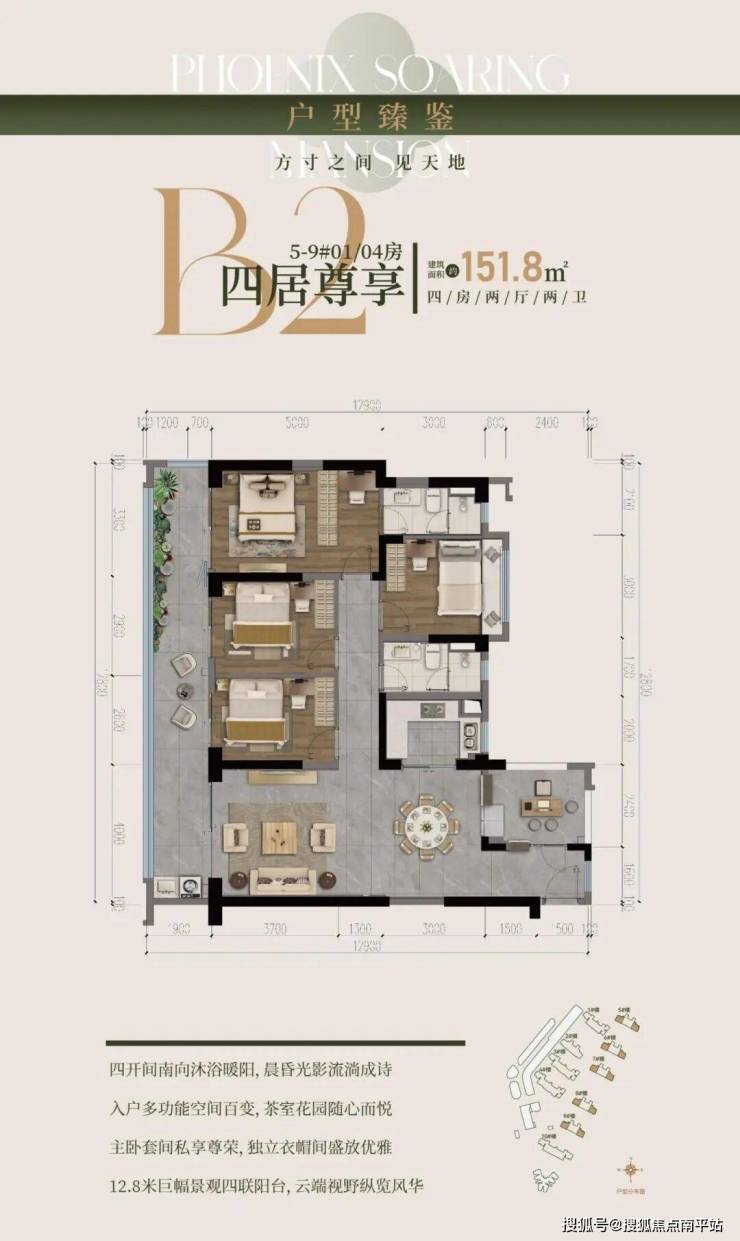 151㎡奢阔四房: 约13米南向四联阳台,引景入室,四开间朝南。独立入户空间灵活可变,套房式主卧兼具私密与尊崇。