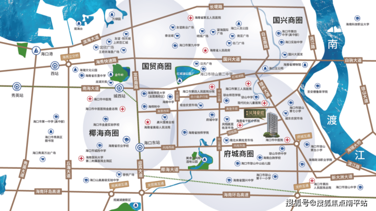 立体交通 · 畅达全城: 紧邻琼州大道城市主轴与东线高速府城互通,约4公里即达国兴CBD,约8公里直达海口东站,迅捷连接美兰机场。