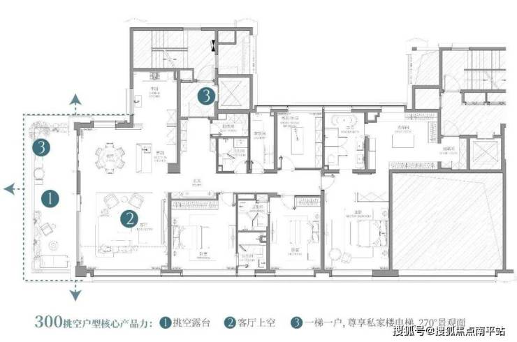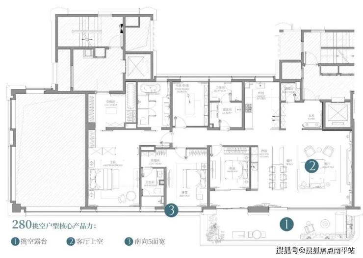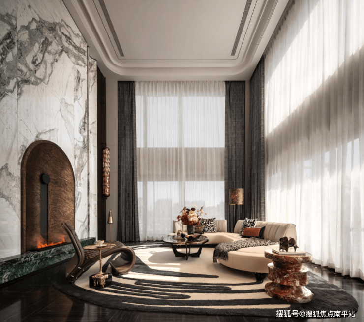 在墅厅设计中,中海地产展现出了非凡的匠心。以建面约 300㎡户型为例,餐客厅空间南、西、北三面均为大面窗,加之约 6.6 米层高,形成 “立体化” 观景视窗。纵向与竖向双维拉升采光观景面,不仅让室内光线更加充足,还彻底消除了室内外界限感,使户外景观能够无界融入室内。在这里,您可以尽情享受普通大平层无法企及的极目视野,仿佛与自然融为一体。