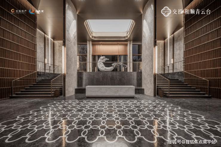 大堂同样很震撼,接近4层楼的挑高,电梯、步梯双入户,祥云纹金属阶梯两段设计,分别取“5”和“9”阶梯步数,寓意着“九五之尊”。
