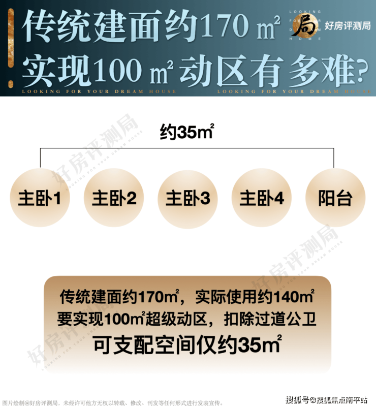 传统170㎡,实际可用面积约140㎡,若想实现100㎡动区,房间势必被挤压成鸽子笼。